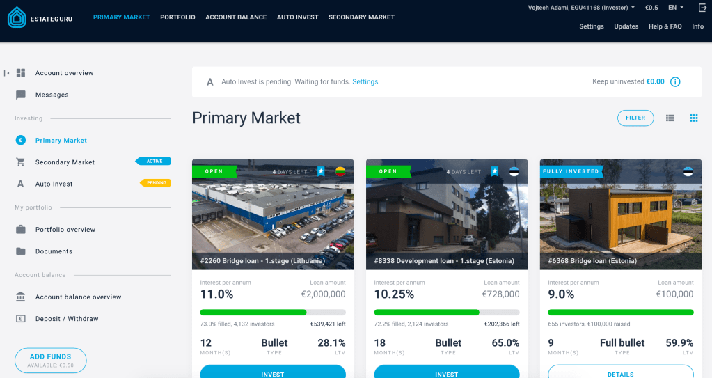 Very clear interface, fast registration, pretty high yield (average return over 12-13 % – most of them with Buyback guarantee!), but you can find even with 15 % and more if you don’t mind some extra risk, especially in other currencies than just EUR.