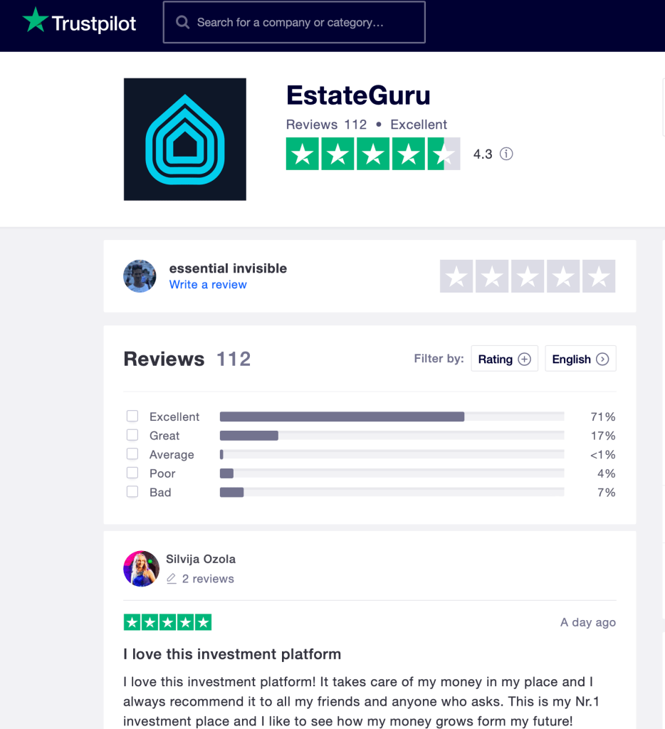 EstateGuru from Estonia, overall positive reviews from investors on TRUSTPILOT.com