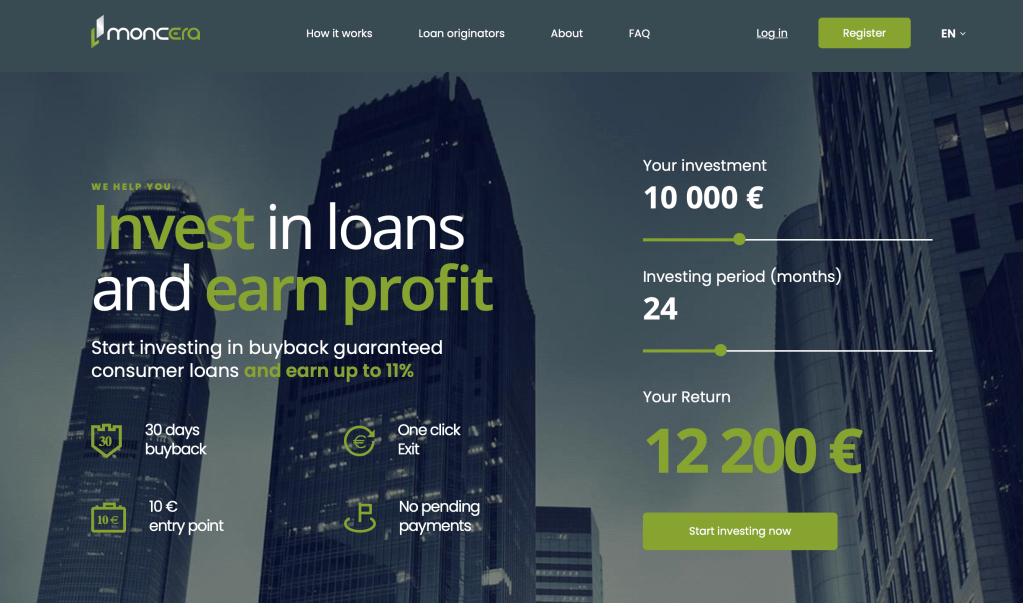 Moncera also offers 30 days buyback, 10 € entry point (investing for everyone), No pending payments (much better than on Mintos) and Auto-invest option.